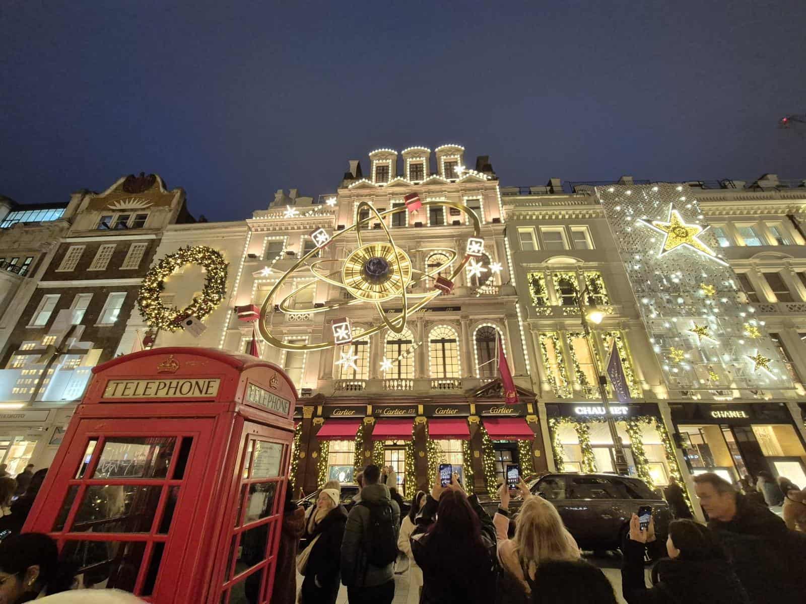 A slight detour onto Berkeley Square brings you to what’s often considered London’s most photographed Christmas displays – Annabel’s private members’ club. While you can’t go inside, their exterior decorations are a spectacular sight that changes theme each year.